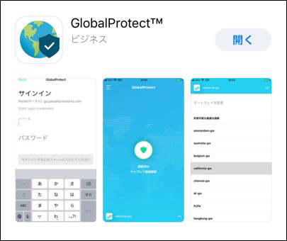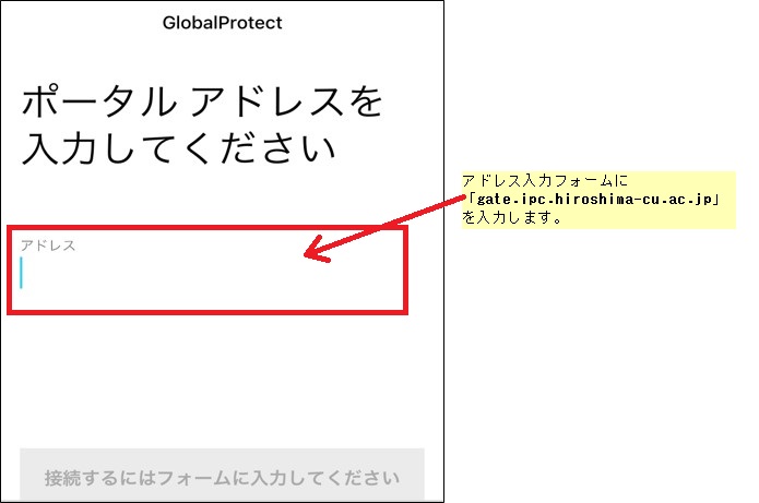 - GlobalPlotectを起動し、アドレスに「gate.ipc.hiroshima-cu.ac.jp」を入力し接続をタップします。