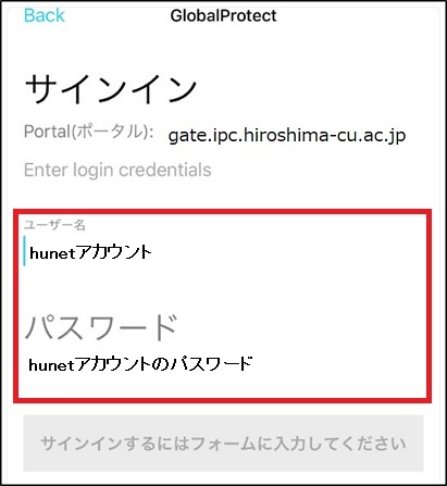 - サインインの画面が出ますので、ユーザー名に「hunetアカウント」をパスワードに「hunetアカウント用のパスワード」を入力し、「サインイン」をクリックします。