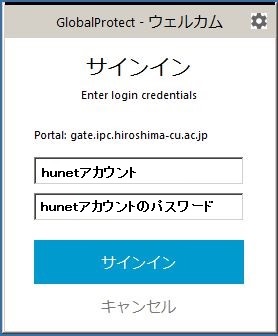 2. 「Username」にhunetアカウントを「Password」にhunetアカウント用のパスワードを入力し、「サインイン」をクリックします。
